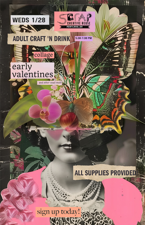 Join us Wednesday, January 28th, 5:30–7:30 PM for a collage art party with the wonderfully chaotic geniuses at SCRAP. We’re making early Valentine’s, gloriously unhinged snail mail, and other paper-based masterpieces your mail carrier will never forget.